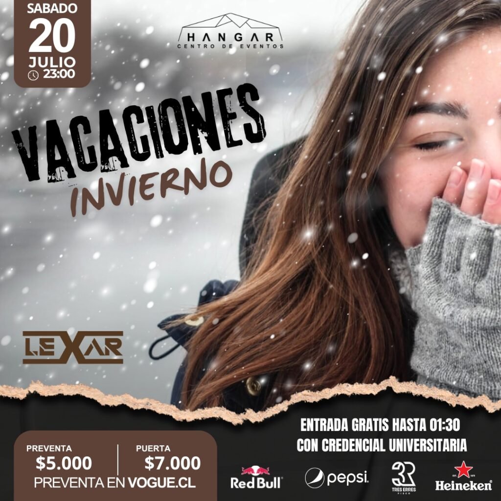 🌨️❄️ Vacaciones de Invierno en Hangar❄️🌨️ 📅 Sábado 20 de Julio ⏰ 23:00 hrs 📍 Hangar Centro de Eventos 🎉 Ven a disfrutar de Vacaciones de Invierno con nosotros. La